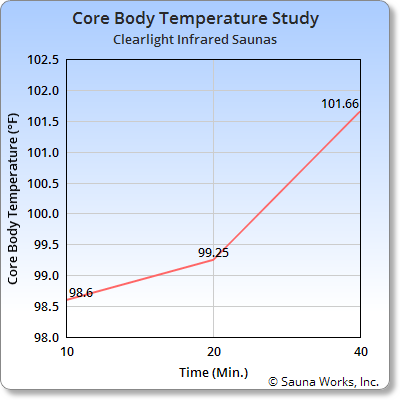 All Clearlight Infrared Sauna® models have been shown to raise core body temperature. The data above from the Arcadia Cancer Clinic in Germany shows an average of a 3% core body temperature increase in a 40 minute Clearlight Infrared Sauna session.