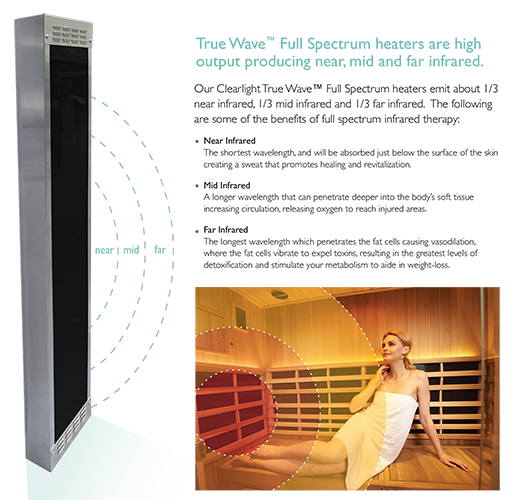 Our Clearlight True Wave™ Full Spectrum heaters emit about 1/3 near infrared, 1/3 mid infrared and 1/3 far infrared. The following are some of the benefits of full spectrum infrared therapy: