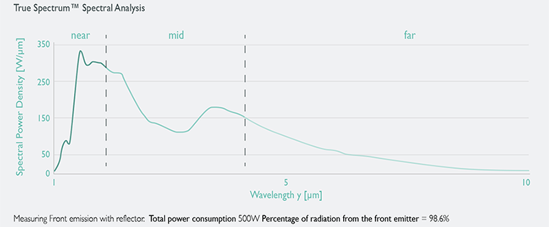 The larger size of our True Wave™ Far Infrared heaters mean more surface area, resulting in lower surface temperature. The result of this low temperature is that our heaters produce more FAR or LONG wave infrared heat which is more therapeutic for your body. This means better performance within the optimal wavelength range of 6 to 12 microns with a large portion of wavelengths at 9.4 microns. The human body absorbs more infrared at 9.4 microns.