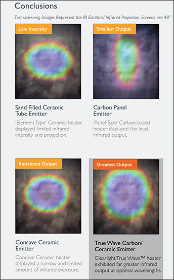 Most infrared heaters used in our competitors’ saunas were designed for industrial use. These infrared heaters are used to cure the paint on cars because it heats the paint from the inside out or as room heaters. Clearlight Infrared True Wave II heaters were designed by us, specifically for use in our saunas and they were designed to heat the human body.